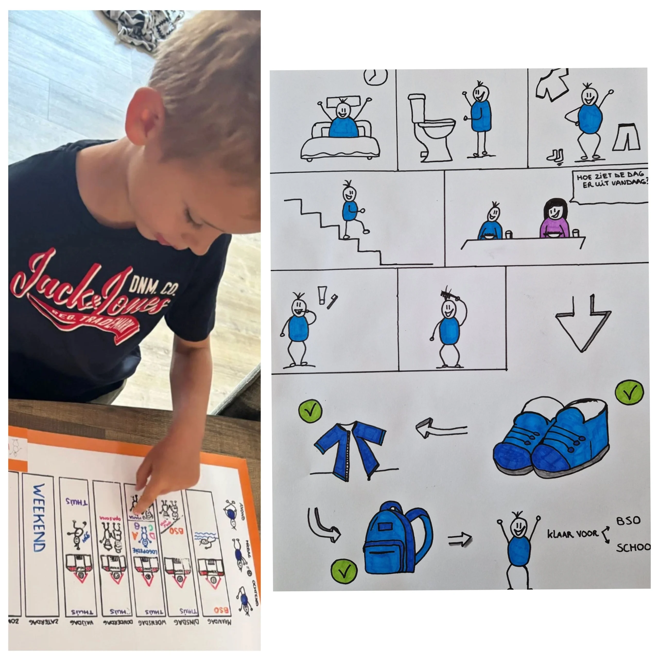 Mijn werk richt zich op het eenvoudiger maken van lastige momenten in het dagelijks leven van gezinnen. Denk hierbij aan ochtend- en bed rituelen, zindelijkheidstraining, eetmomenten of überhaupt structuur in de dag. Ik help je door samen met jou/jullie een oplossing te bedenken voor het probleem waar je tegenaan loopt. Dit maak ik vervolgens visueel in een praatplaat.